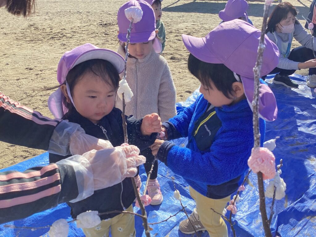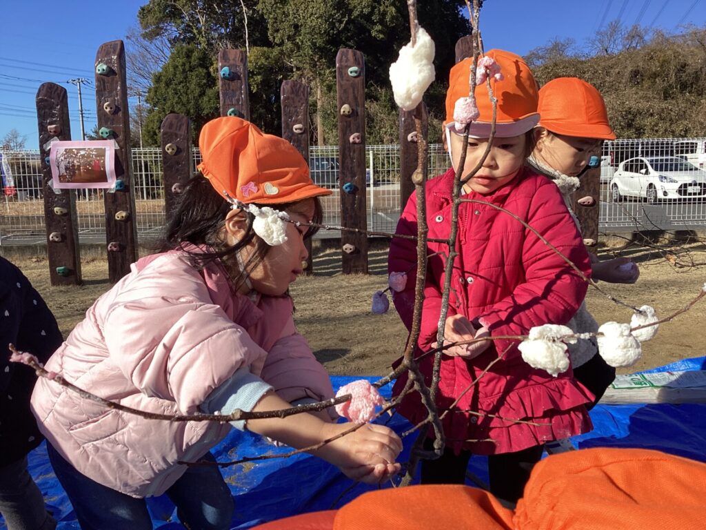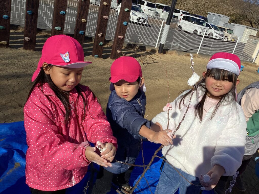 子ども達も丸めたお餅を枝に括り付けていきます。