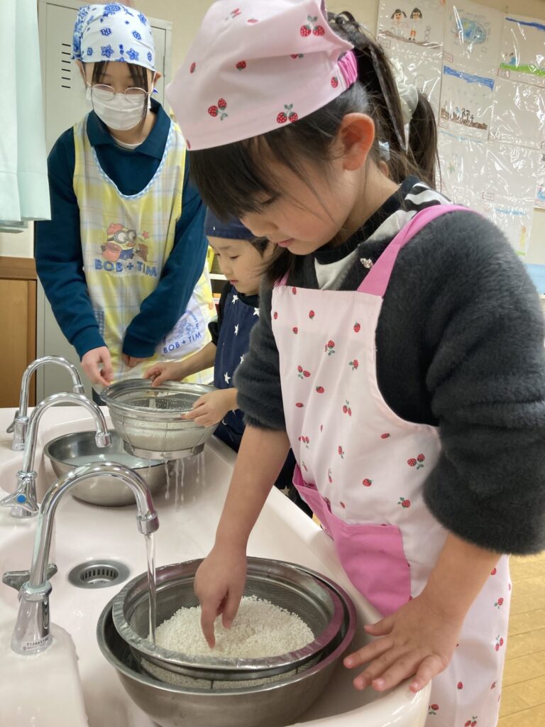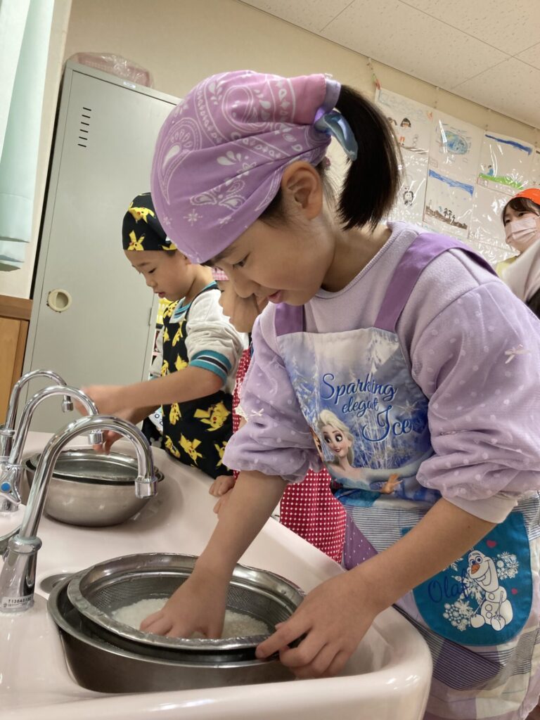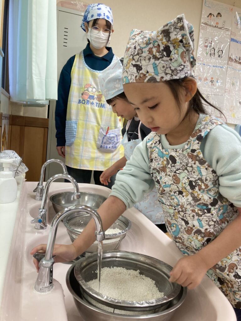 5歳児は、前日にもち米を研いで下準備をしてくれました。