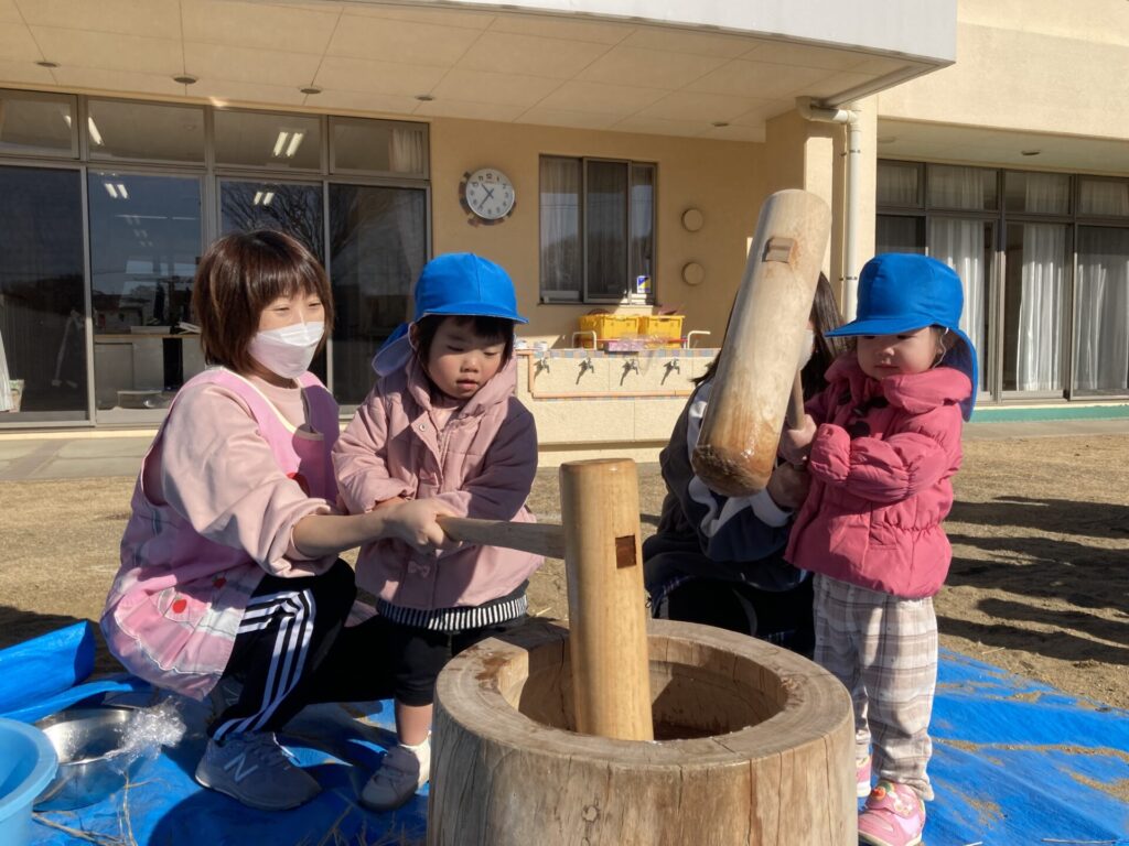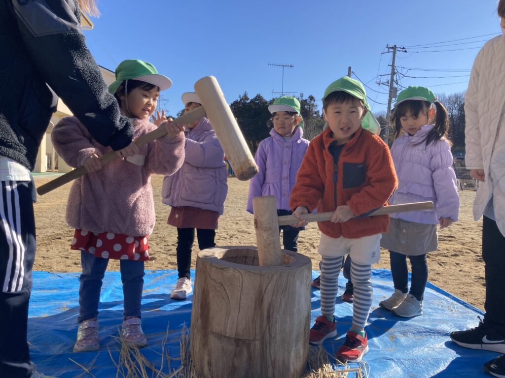 お餅をついている子だけでなく、周りの子ども達も大きな声で応援して立派なお餅がつけました🫠