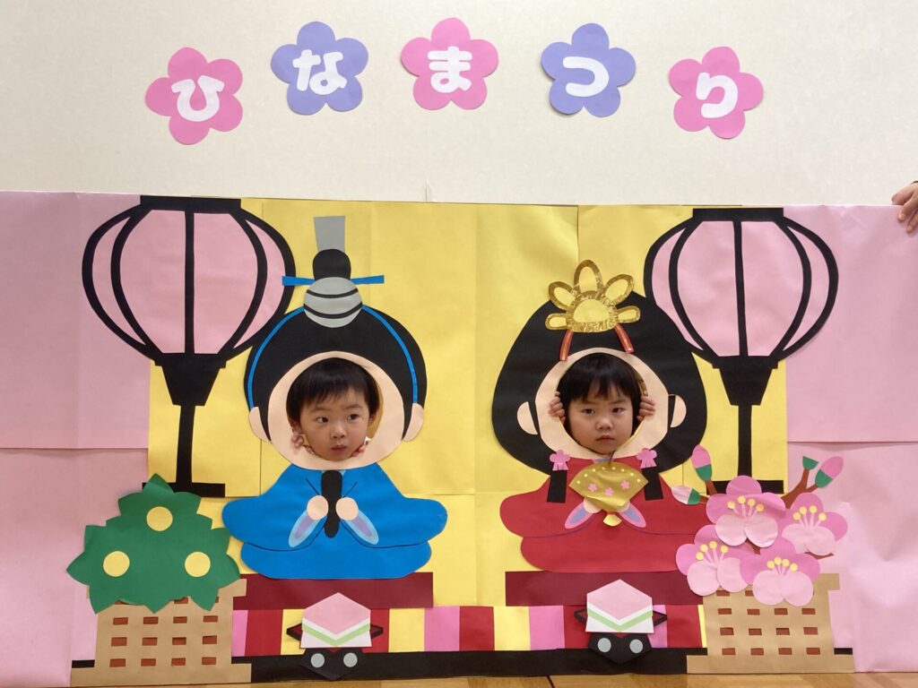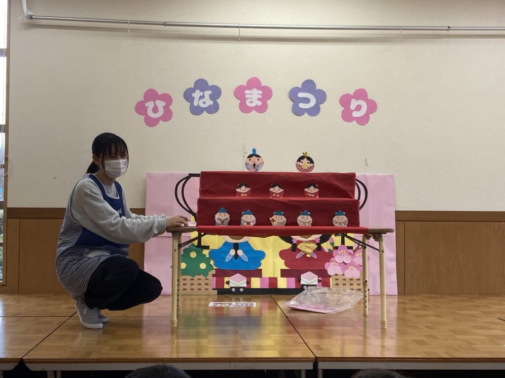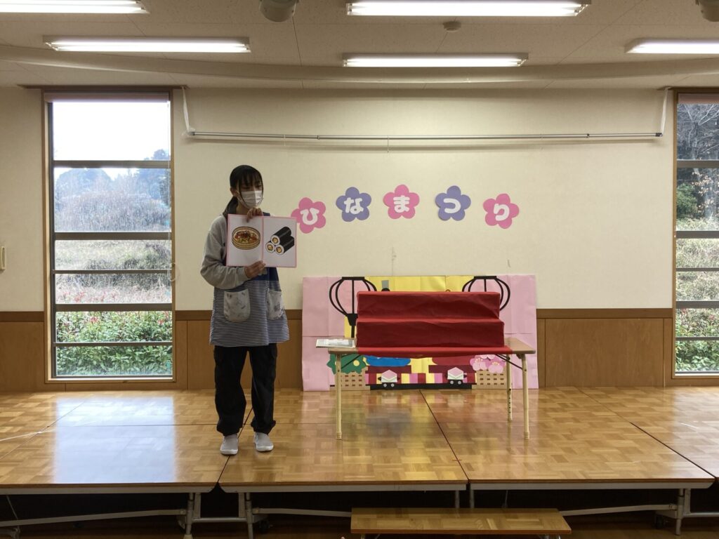 みんなでひな祭りの歌を歌ったり、由来や食べ物のクイズをして子ども達と楽しみました。